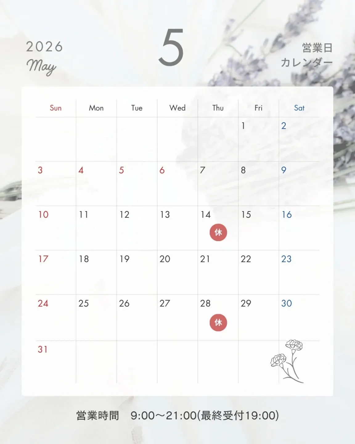 皆様、こんにちは!5月の営業日のご案内です。